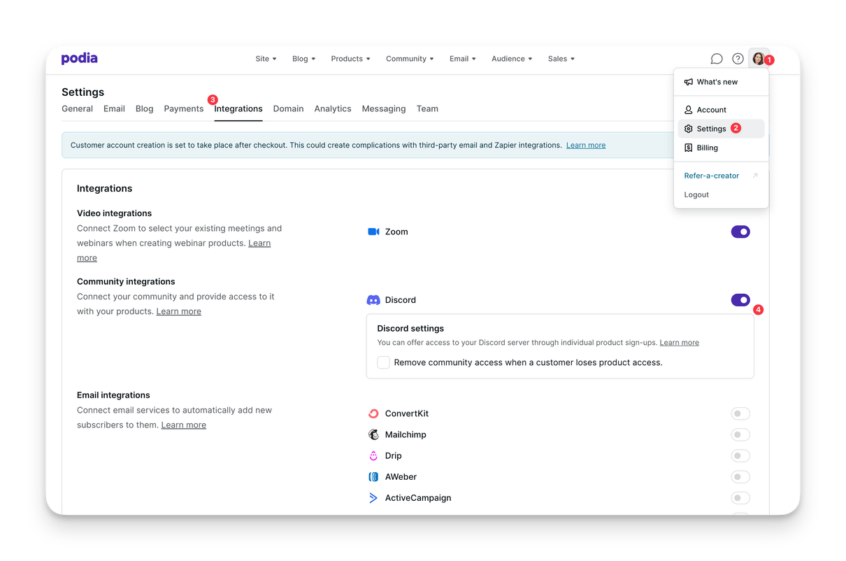 Puis naviguer jusqu’aux paramètres Podia, dans l’onglet Integrations.