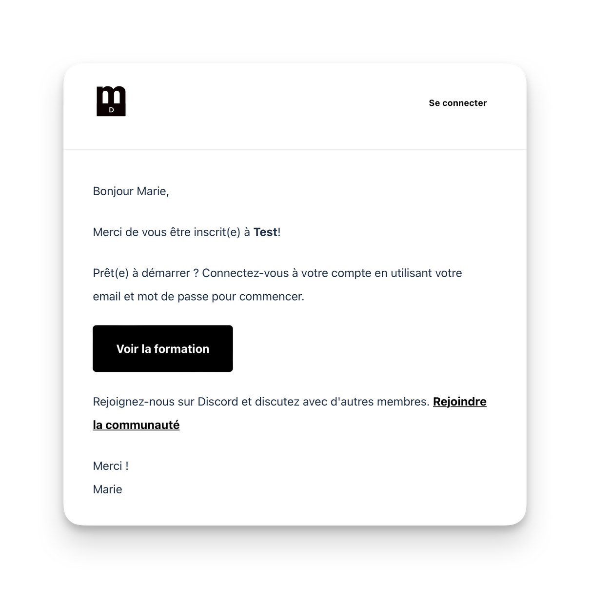 Quand un client rejoint ou achète un produit lié à Discord, il va recevoir un email d’achat. Qui lui confirme le produit acheté, et en dessous du bouton ‘Voir la formation’, il y a un lien vers le serveur Discord.