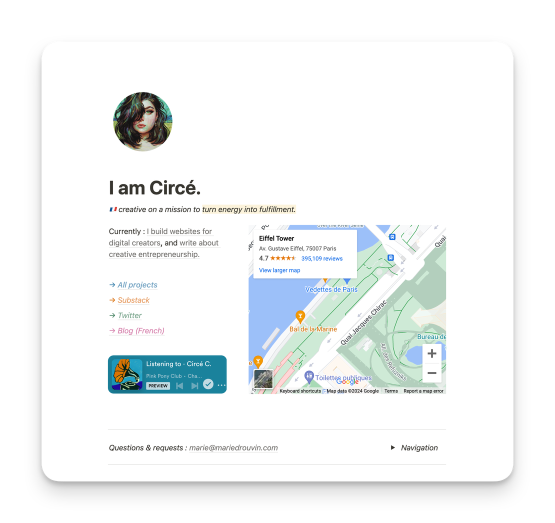 Si tu as un magasin physique, proposes des visites guidées, ou loues un Airbnb, intégrer Google Maps sur ton site Notion est un must. Une carte Google Maps permet aux visiteurs de localiser facilement ton emplacement.