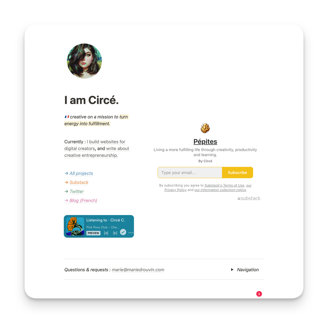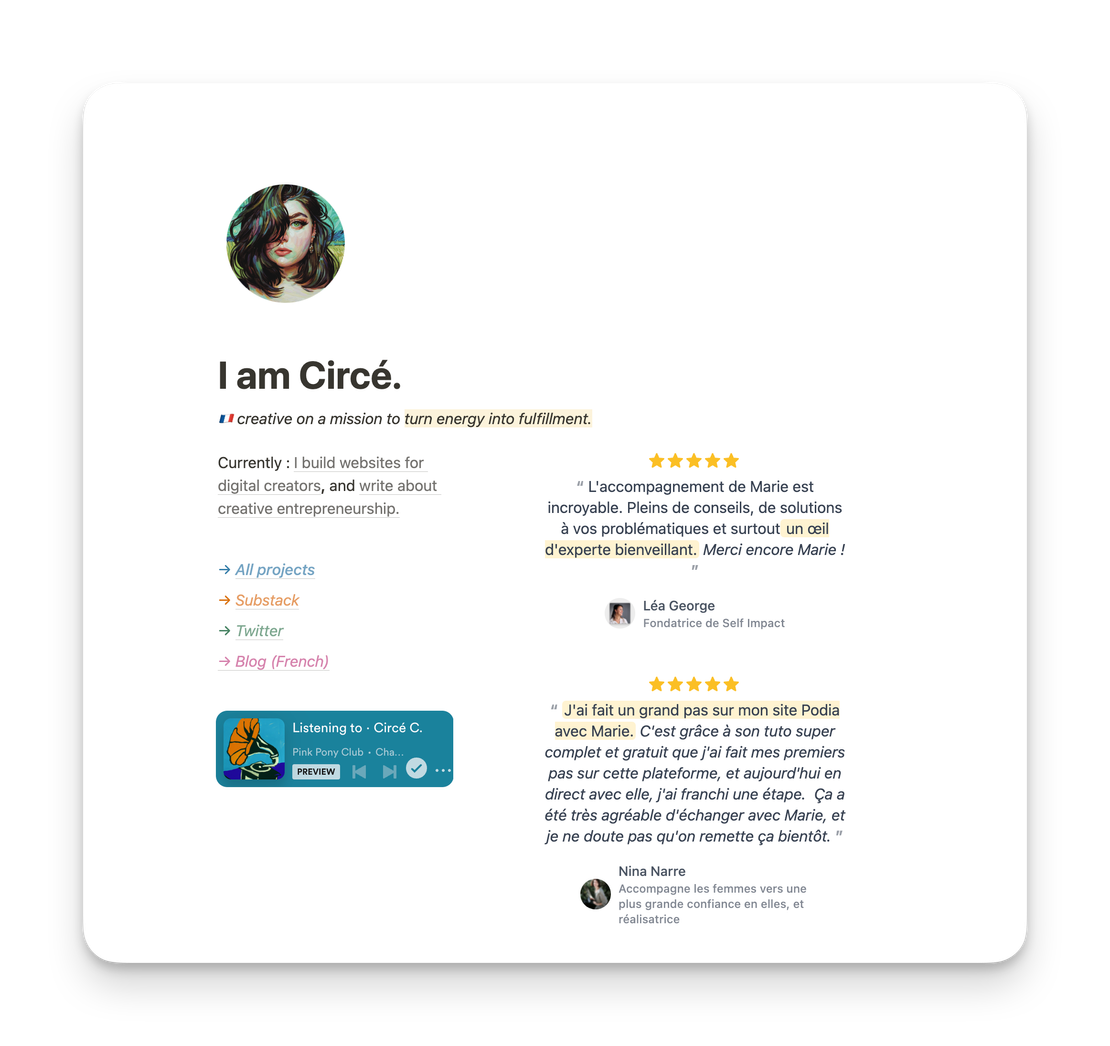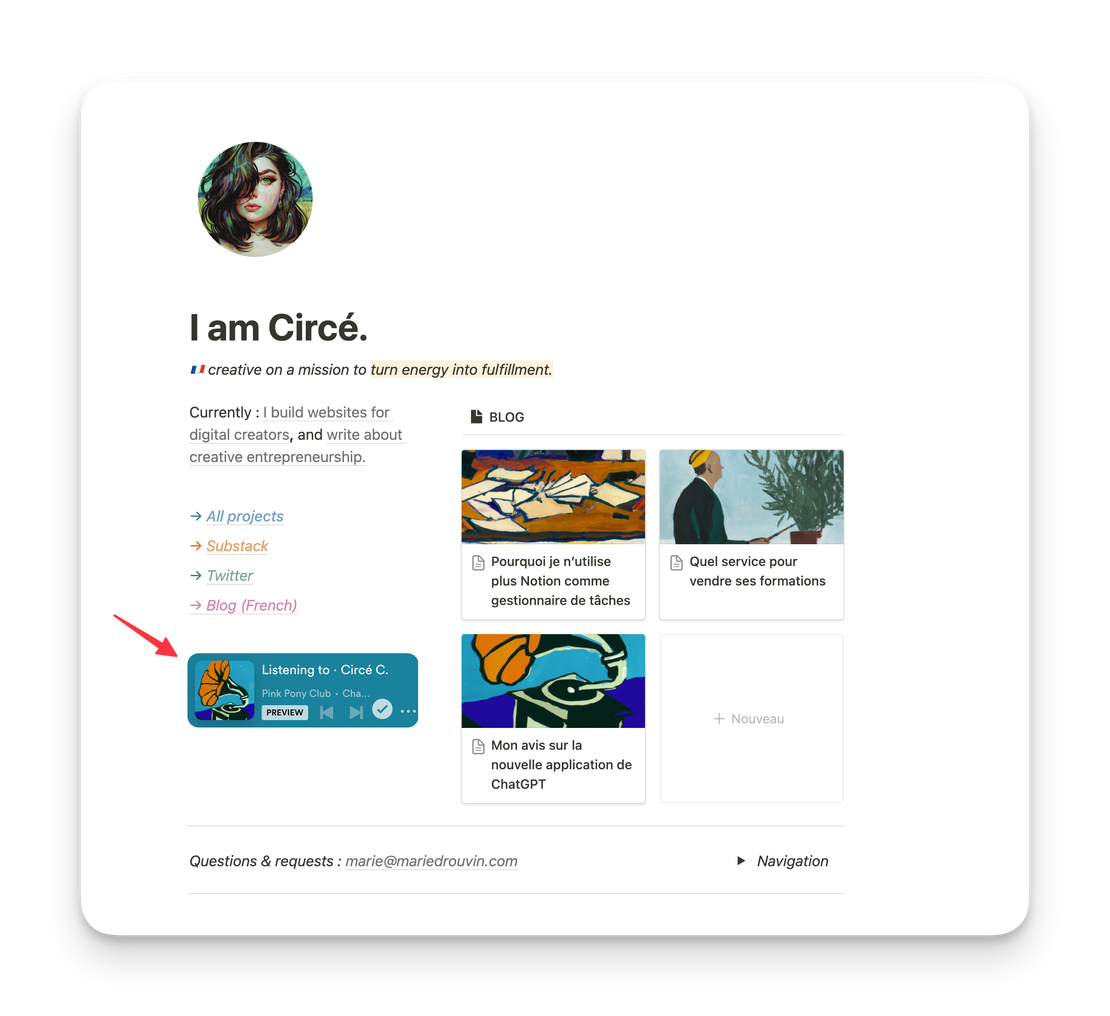 Tu peux très bien intégrer un fichier audio sur Notion. Il suffit de le faire glisser sur ta page, et tu vas pouvoir l’écouter comme ça. Mais sur un site, ce n’est pas intéressant d’avoir le fichier audio, parce que l’idée, c’est de faire découvrir ta musique (ou celle de quelqu’un d’autre).