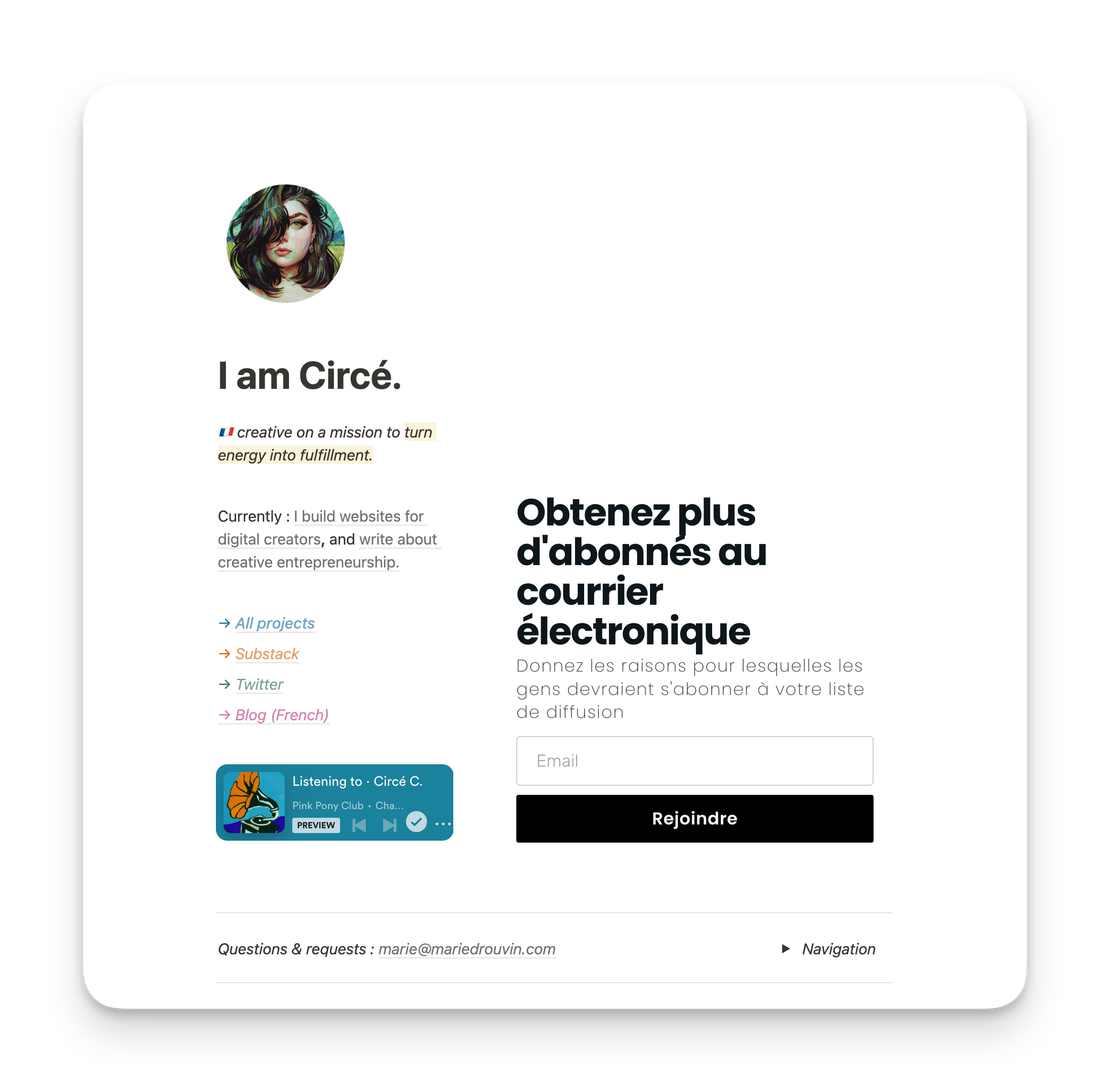 Mais, sur Podia, ça ne fonctionne pas comme ça. Podia ne permet pas une intégration directe comme Substack, mais il y a une astuce : crée une page spécifique sur Podia avec uniquement le formulaire d'inscription.
