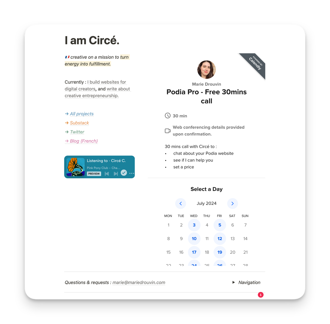 Perso, j’utilise Calendly (sur Podia, mais ça fonctionne de la même manière sur Notion). Ça me permet d’automatiser la prise de rendez-vous et toutes les petites tâches autour : créer le lien Zoom, envoyer un rappel, poser des questions avant le rendez-vous…