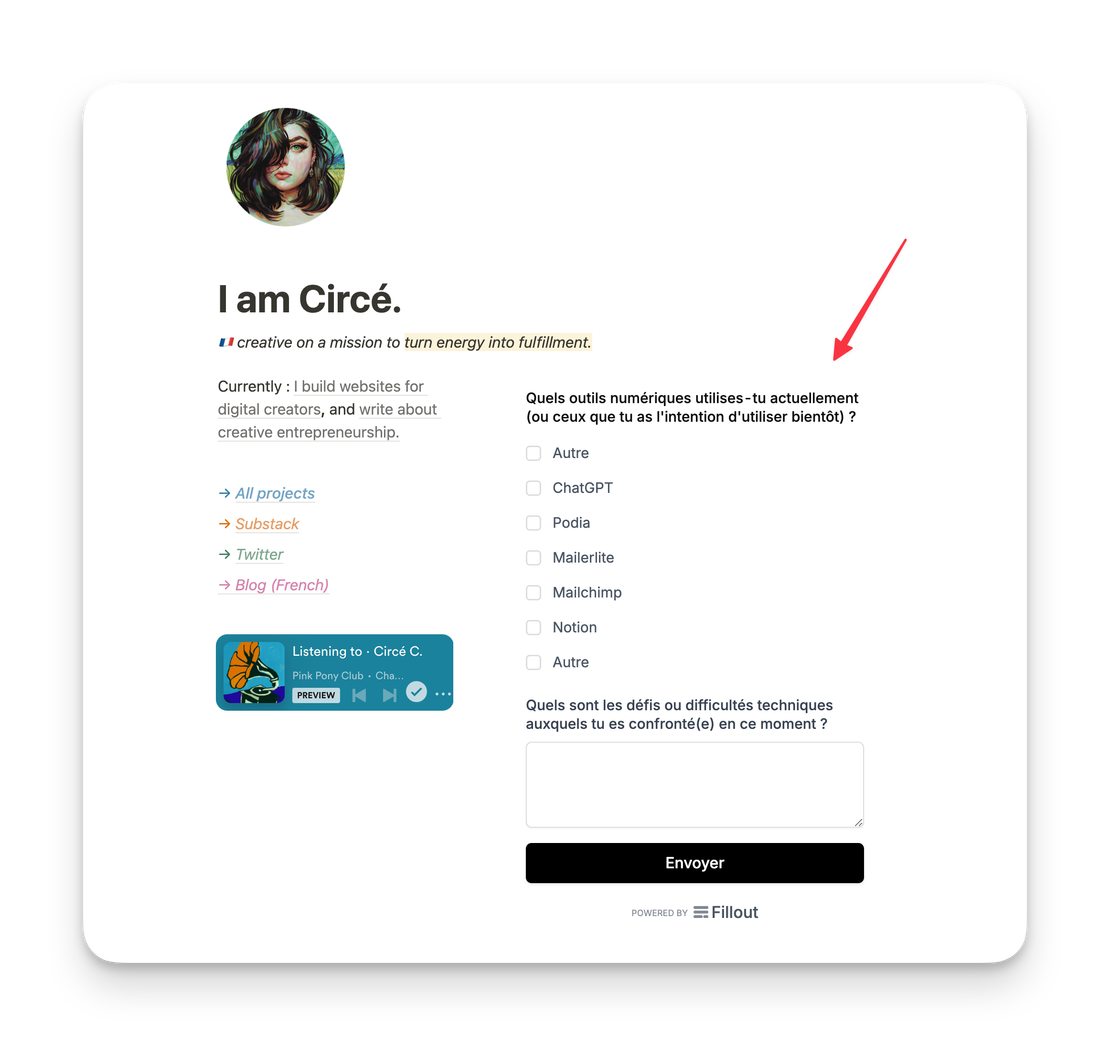 Perso, j’utilise Fillout. Parce que c’est gratuit, et qu’il est très très sympa à utiliser. Mais Typeform et autres Google Forms fonctionnent également.