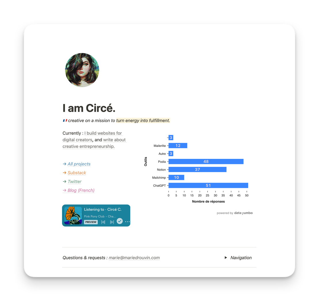 J’utilise Data Jumbo (parce que c’est gratuit jusqu’à 3 graphismes). Mais (spoiler) on devrait avoir accès à Notion Charts cet été, et pouvoir faire ça nativement sur Notion.