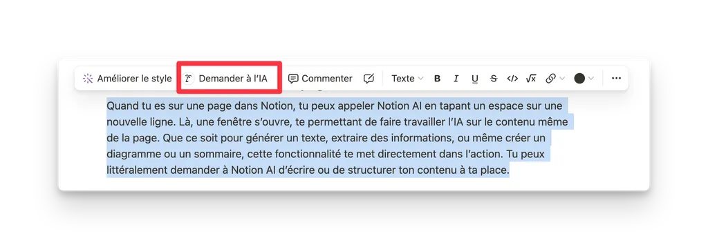 Quand tu es sur une page dans Notion, tu peux appeler Notion AI en tapant un espace sur une nouvelle ligne. Où, en sélectionnant ton texte, et en cliquant sur le bouton ‘Demander à l’IA’. Là, une fenêtre s’ouvre, te permettant de faire travailler l’IA sur le contenu même de la page. Que ce soit pour générer un texte, extraire des informations, ou même créer un diagramme ou un sommaire, cette fonctionnalité te met directement dans l’action. Tu peux littéralement demander à Notion AI d’écrire ou de structurer ton contenu à ta place.