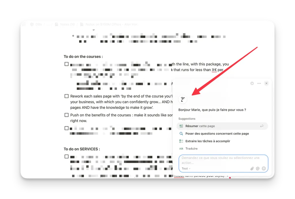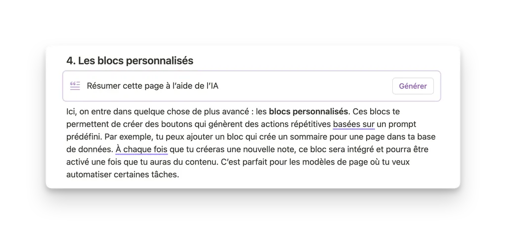 Ici, on entre dans quelque chose de plus avancé : les blocs personnalisés. Ces blocs te permettent de créer des boutons qui génèrent des actions répétitives basées sur un prompt prédéfini. Par exemple, tu peux ajouter à ton modèle de Notion, un bloc qui crée un sommaire. À chaque fois que tu créeras une nouvelle note, ce bloc sera intégré et pourra être activé une fois que tu auras du contenu. C’est parfait pour les modèles de page où tu veux automatiser certaines tâches.
