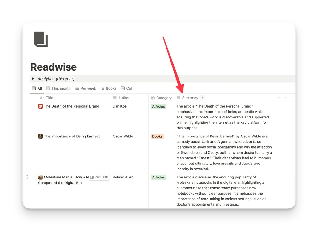 Enfin, Notion AI peut également intervenir au niveau des propriétés des bases de données. Ce sont les propriétés que tu retrouves dans chaque page de ta base de données, comme la date, l’auteur, ou l’URL. En ajoutant des propriétés d’intelligence artificielle, tu peux automatiser certaines mises à jour, comme un sommaire de la page qui s'affiche directement dans la base de données. Perso, je l’utilise dans ma base de données des livres et articles que je lis : j’ai un sommaire généré automatiquement pour chaque ouvrage ou article. Pas besoin d’ouvrir la page, j’ai un aperçu direct.