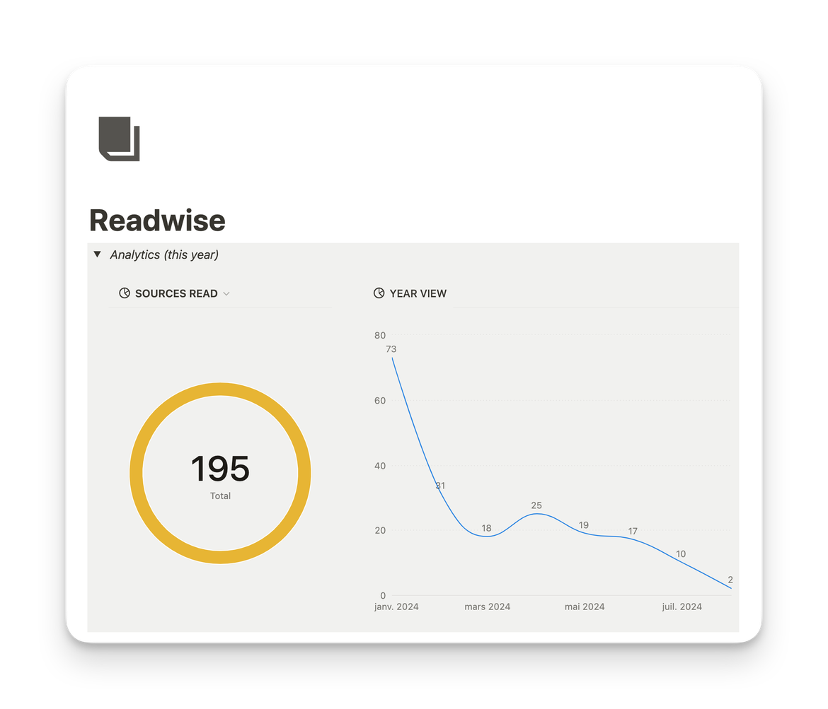 Readwise récupère tout ce que je lis et surligne, que ce soit dans des articles, des livres ou des newsletters, et l'enregistre dans ma base de données Notion. Cela me permet de suivre combien de sources j'ai lues au fil de l'année et de voir comment ce volume se répartit mois par mois.
