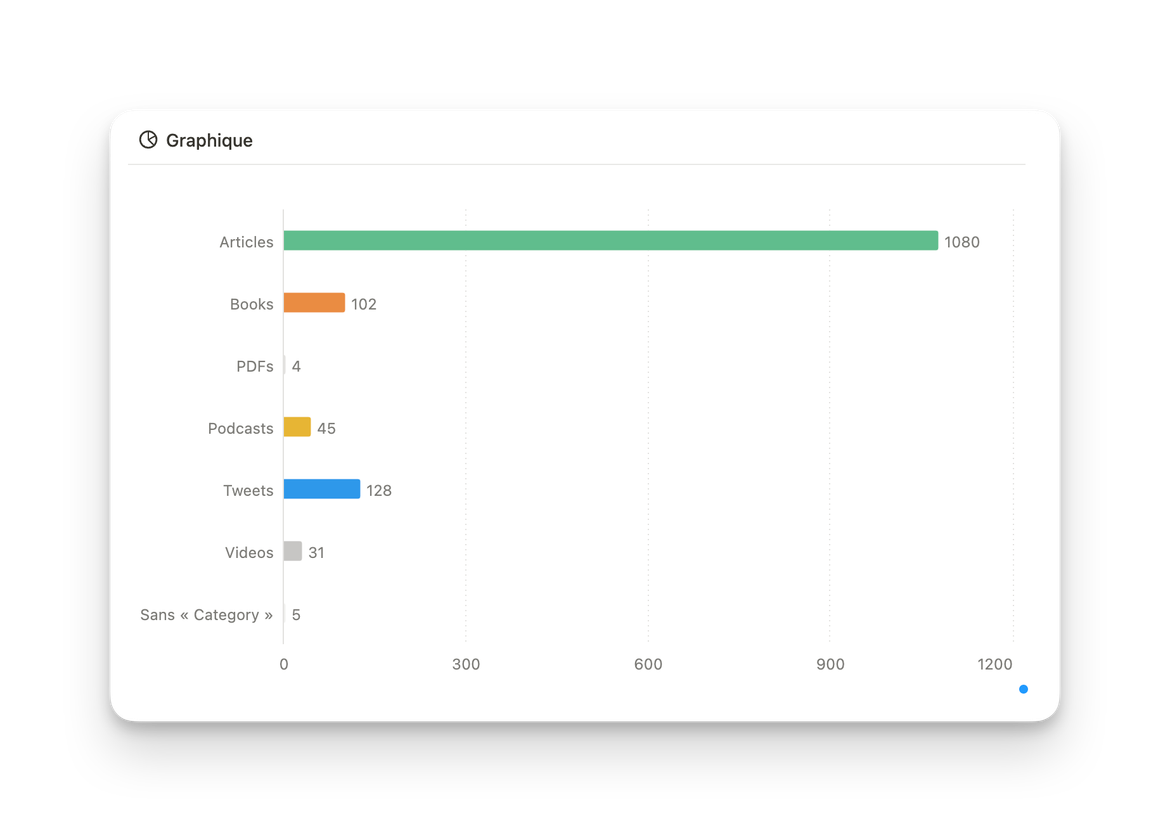 Exemple : Si tu veux visualiser combien d’articles par rapport à d’autres types de contenu (livres, podcasts, vidéos) tu as enregistrés dans ta base de données de sources, ce graphique te montrera clairement les différences de volume.