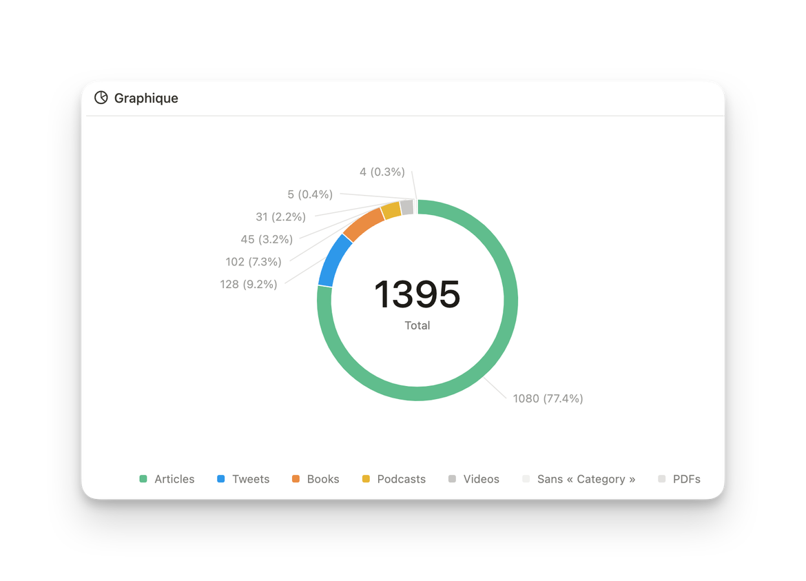 Exemple : Utilise-le pour voir la répartition des différents types de contenus que tu as enregistrés (articles, vidéos, podcasts, etc.), avec un aperçu immédiat des proportions respectives.