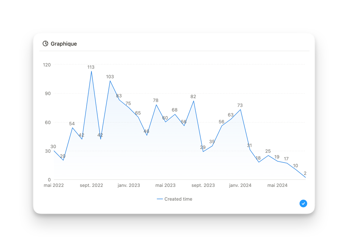 Notion a déjà annoncé que de nouveaux types de graphiques seront bientôt disponibles, comme un graphique simplifié qui te permettrait de ne montrer qu’un seul chiffre total. Mais au délà de ce genre de choses, il y a quelques limites à garder en tête.