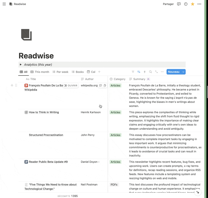 Ensuite, j’ai utilisé Notion Charts pour analyser ma base de données de sources, qui est connectée à Readwise.