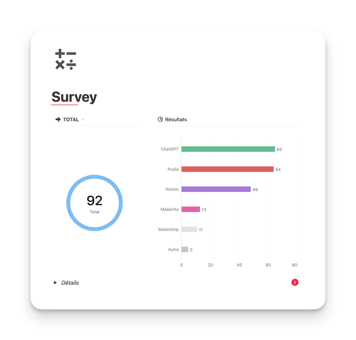 Je propose un petit questionnaire aux personnes qui s'inscrivent à ma newsletter pour mieux comprendre les outils qu'elles utilisent. Avec Notion Charts, je peux visualiser non seulement le nombre total de réponses, mais aussi les outils les plus fréquemment utilisés par mes abonnés.