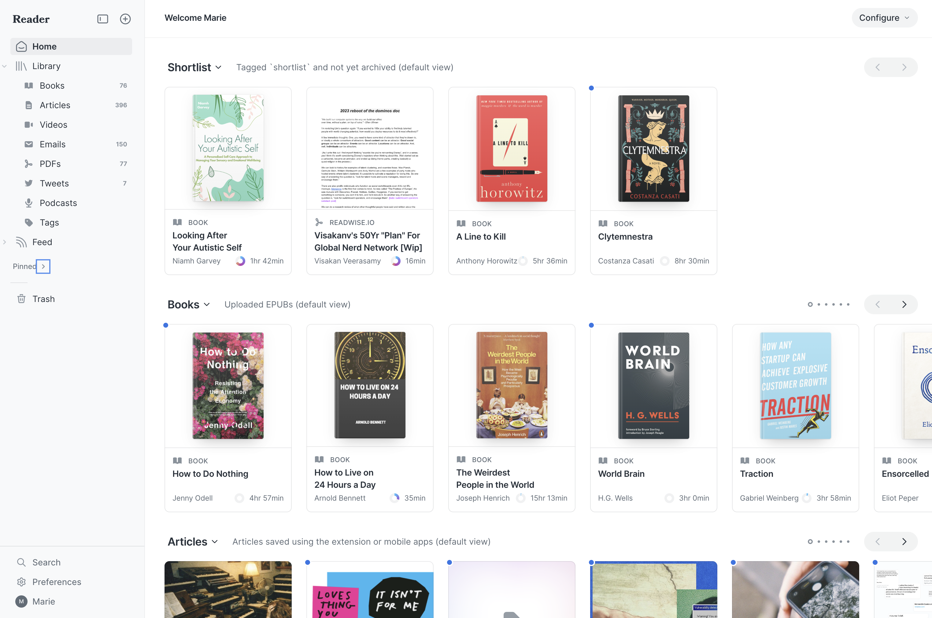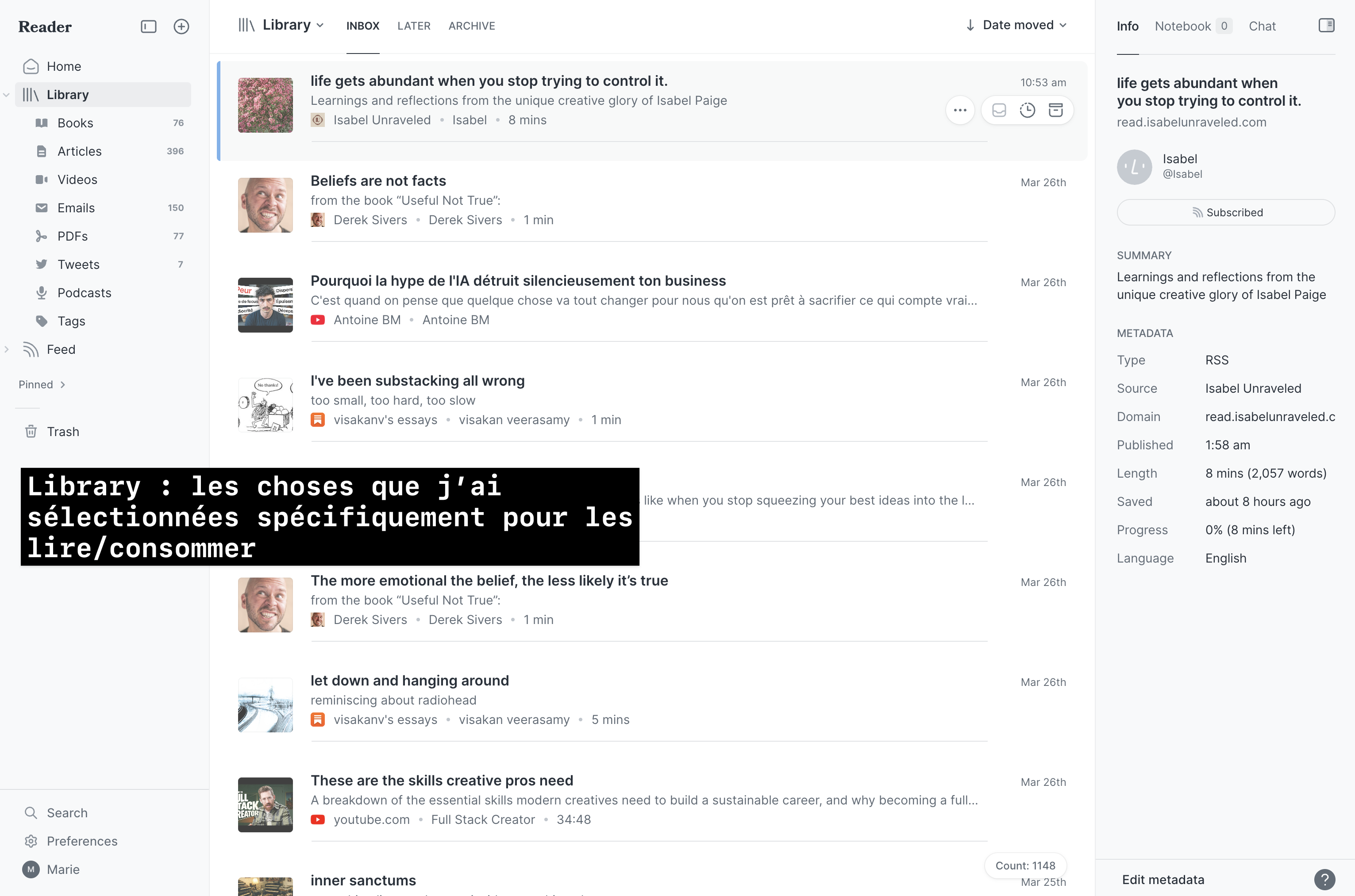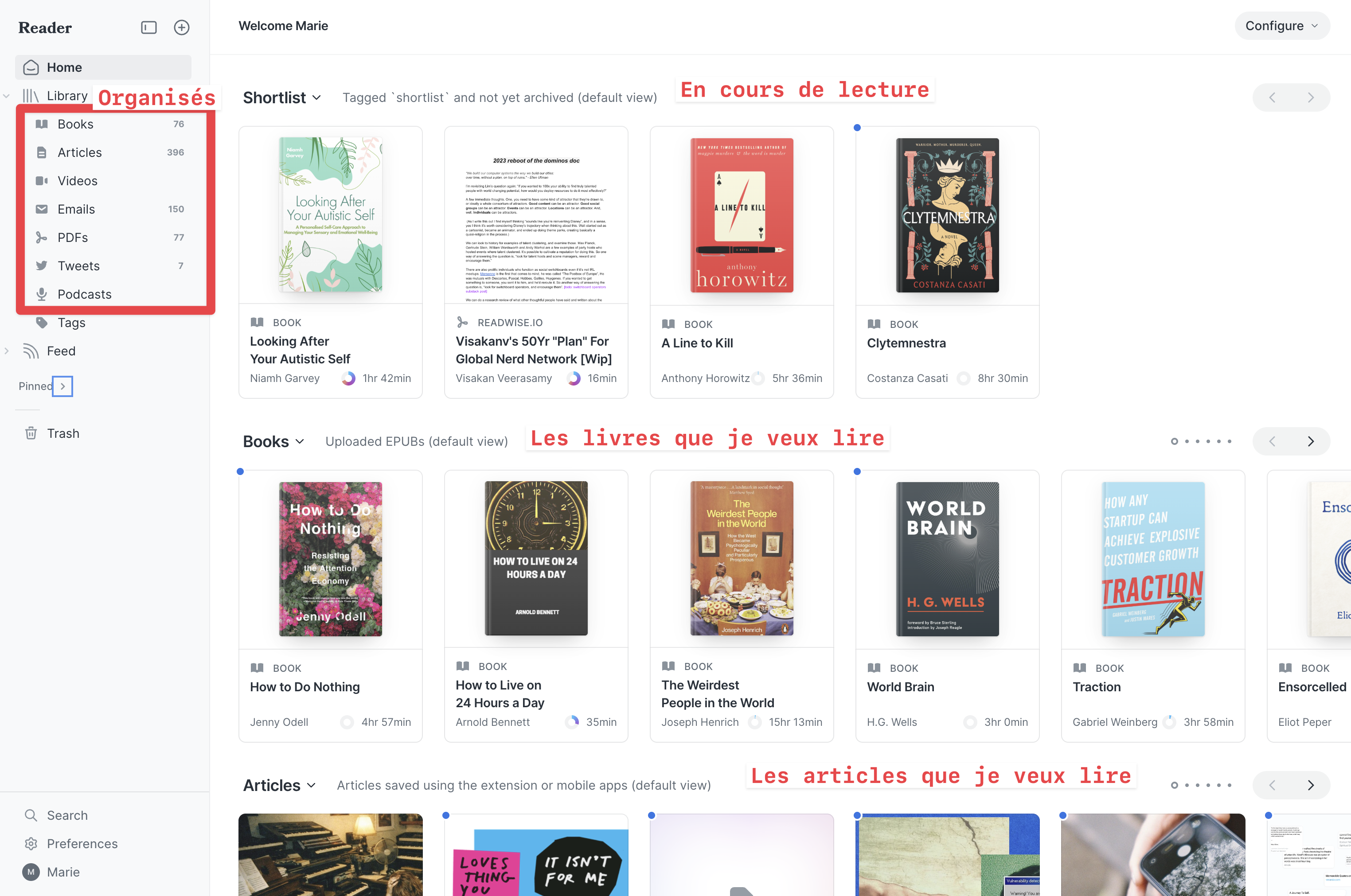 Et que techniquement, tu n'as jamais besoin d'aller ailleurs pour lire quelque chose. Tout arrive là. Dans un endroit calme, que tu maitrises et que tu peux organiser comme TOI tu en as envie. Je crois que c'est hyper important si tu as des ambitions importantes de lecture ou d'apprentissage.