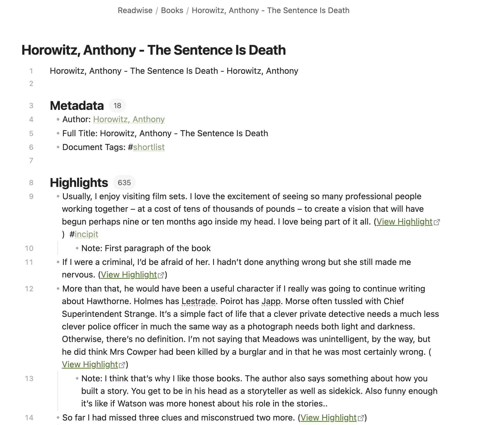 Je te montre à quoi ça ressemble chez moi : j'ai tous mes highlights du Hobbit ici, avec mes notes. Quand je parle d'une idée dans mon journal et que je veux faire référence à ce que j'ai lu, je fais un lien direct. Je n'ai pas à aller chercher l'URL, je n'ai pas à ouvrir Reader — tout est déjà là, lié.