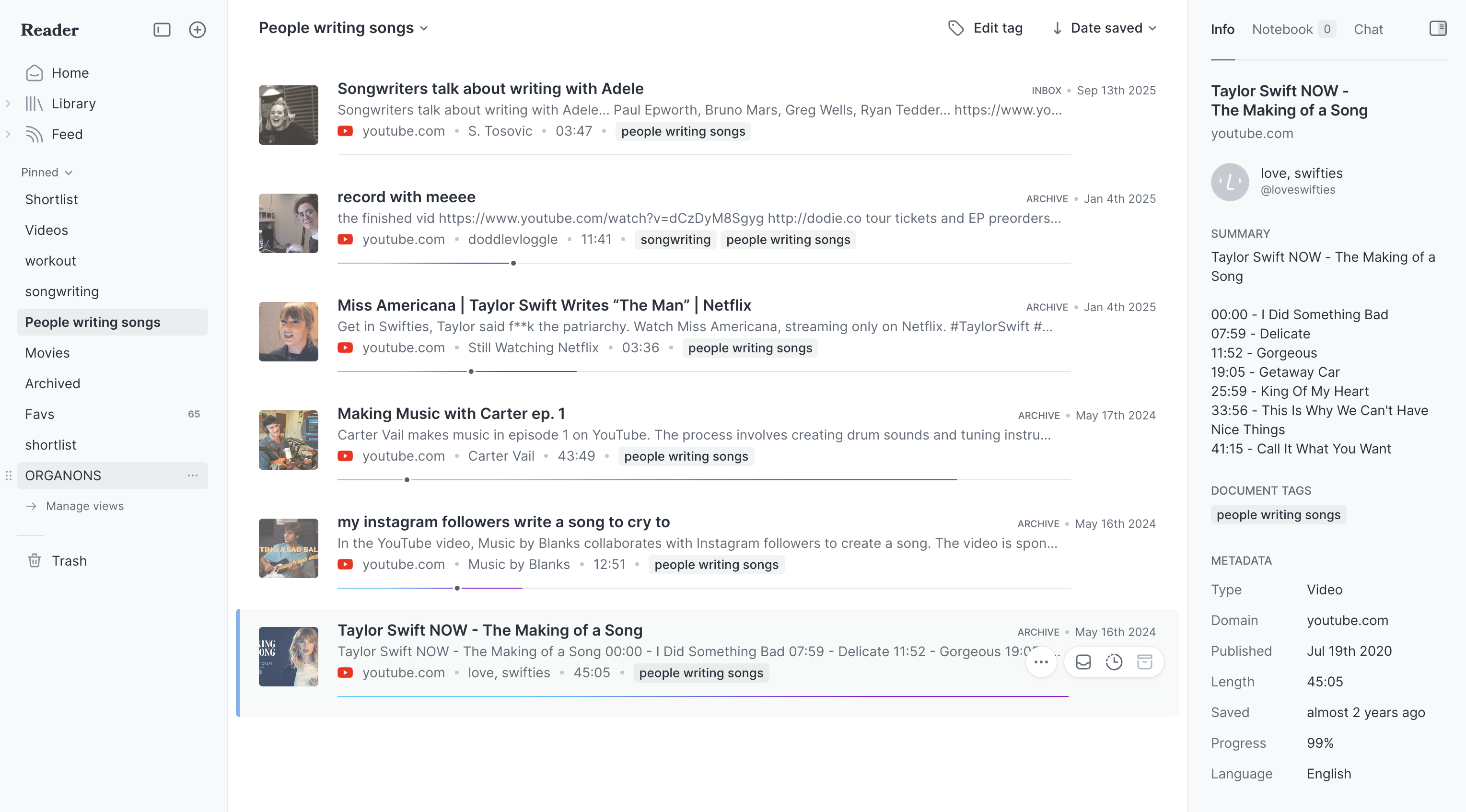 un tag "people writing songs" pour des vidéos, des articles, des gens qui enregistrent en train d'écrire. Quand j'écris une chanson et que j'ai besoin de m'inspirer, j'ouvre le tag et tout est là.