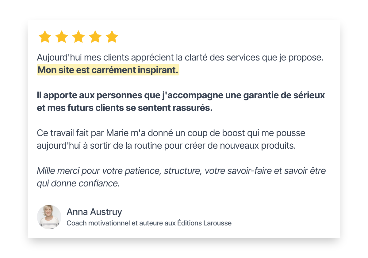 Quand tu as un site qui fonctionne bien ET qui te ressemble, tu as envie de le partager. Comme Anna, tu as une vision claire de ce que tu fais, et ça te booste forcément.
